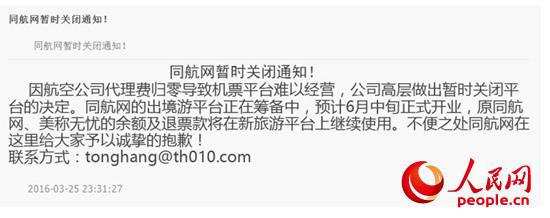 人民网北京5月10日电 (记者张希)“同航倒闭不退票款天理何在”、“北京同航网诈骗机票不退积压资金”、“8家公司联合投诉同航网”,2016年3月底到4月,人民网旅游3·15投诉平台陆续出现多起关于同航网的投诉。这些投诉中均提到,3月19日同航网突然宣布平台关闭,导致采购商无法采购机票,机票退款无法取出,并无法与同航网联系。同航卷款而逃了吗?人民网记者就此展开调查。