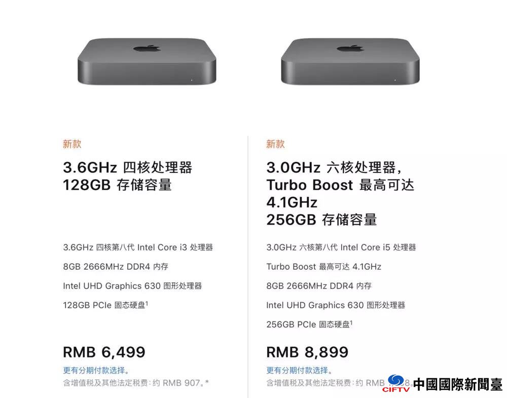 新 Mac mini 基本配置为 8GB 的运行内存、搭载 3.6GHz 的四核酷睿 i3 处理器,内置 8GB 2666Mhz DDR4 运行内存、128GB PCIe 固态硬盘。