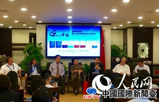 人民网北京7月28日电 中国新型智库G20研究成果28日集中亮相。当日,“G20与中国”国际研讨会暨G20研究系列智库专著发布会在中国人民大学重阳金融研究院举行。人大重阳研究团队撰写的《2016:G20与中国》中英文双语版本、《G20蓝皮书2015-2016》中英文双语版本、《G20与可持续发展》等8部G20研究系列智库专著集体面世,全面阐述并探讨G20与中国贡献。