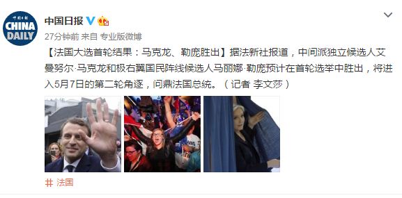 据法新社报道,中间派独立候选人艾曼努尔·马克龙和极右翼国民阵线候选人马丽娜·勒庞预计在首轮选举中胜出,将进入5月7日的第二轮角逐,问鼎法国总统。