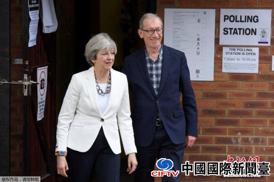 当地时间6月8日,英国大选开始投票,特雷莎·梅与其丈夫菲利普一起在英国桑宁(Sonning)一处投票站投票。