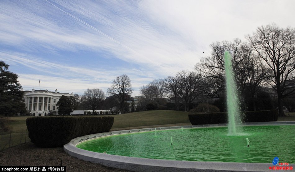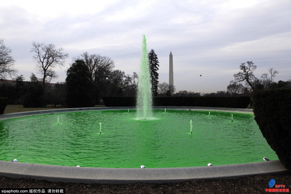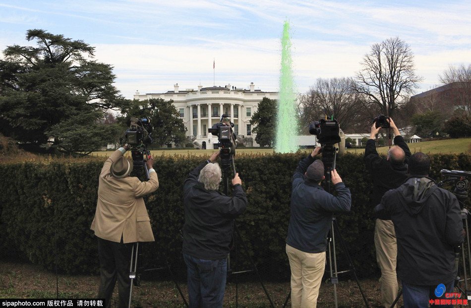 白宫草坪喷泉变绿色 庆圣帕特里克节