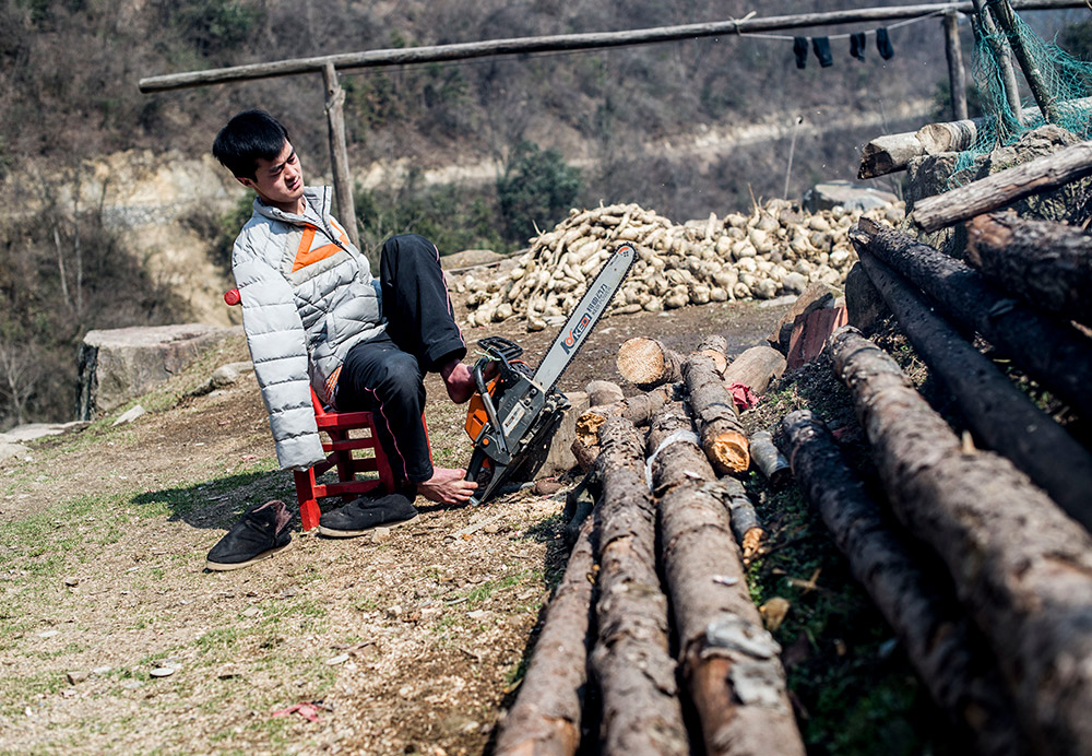 陈兹方在家中用油锯锯柴(3月2日摄)。 查看原图|更多图库