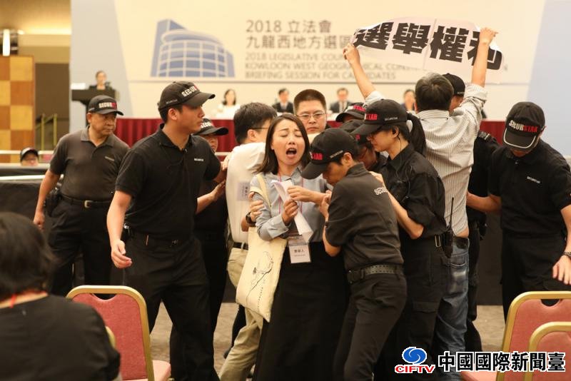 选举管理委员会昨晚为下月25日投票的立法会九龙西补选举行简介会,介绍选举法例和指引,及为5名获有效提名的候选人抽籤决定编号,反对派却藉机做骚捣乱!早前因“自决”政纲违反基本法而被裁定提名资格无效(DQ)的刘小丽、其“Plan B”李卓人及助选团在现场大肆闹事,阻路、叫嚣、拉扯、爆粗,终被抬走离场。市民怒斥刘李等人的言行“乞人憎”。/大公报记者 莊恭诚 冼国强