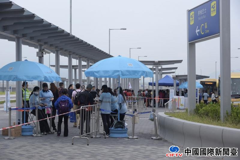 大桥通车后第二个周日,大桥香港口岸自中午起已有大批内地旅客,乘搭俗称“金巴”的穿梭巴士,离港往澳门或珠海口岸。离境高峰期间,候车人龙曾长达逾千人。