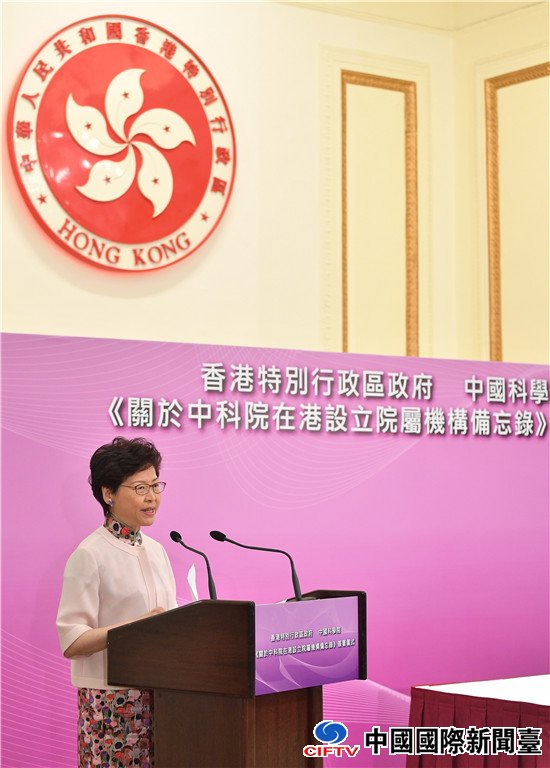 图/林郑月娥在香港特别行政区政府与中国科学院《关于中国科学院在香港设立院属机构的备忘录》签署仪式致辞