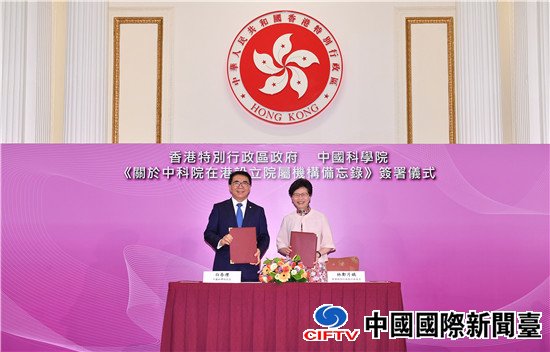 林郑月娥(右)和中国科学院院长白春礼教授签署《关于中国科学院在香港设立院属机构的备忘录》