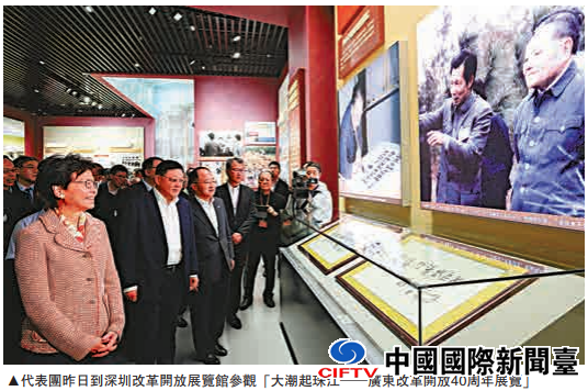 为庆祝国家改革开放40周年,行政长官林郑月娥率领超过160人的代表团访问深圳及北京三日。代表团昨日首先到访改革开放的龙头城市深圳,参观了国家主席习近平早前到广东时考察过的深圳改革开放展览馆和前海,代表团顾问、中联办主任王志民及深圳市委书记王伟中等亦一同参观。林郑月娥表示,香港是国家改革开放的贡献者、受惠者,又在展览馆留下“共心同行,共谋发展”八字。王伟中认为,香港推动改革开放的作用不可替代、贡献不可磨灭,今天香港依然是深圳学习的榜样、发展的标杆。