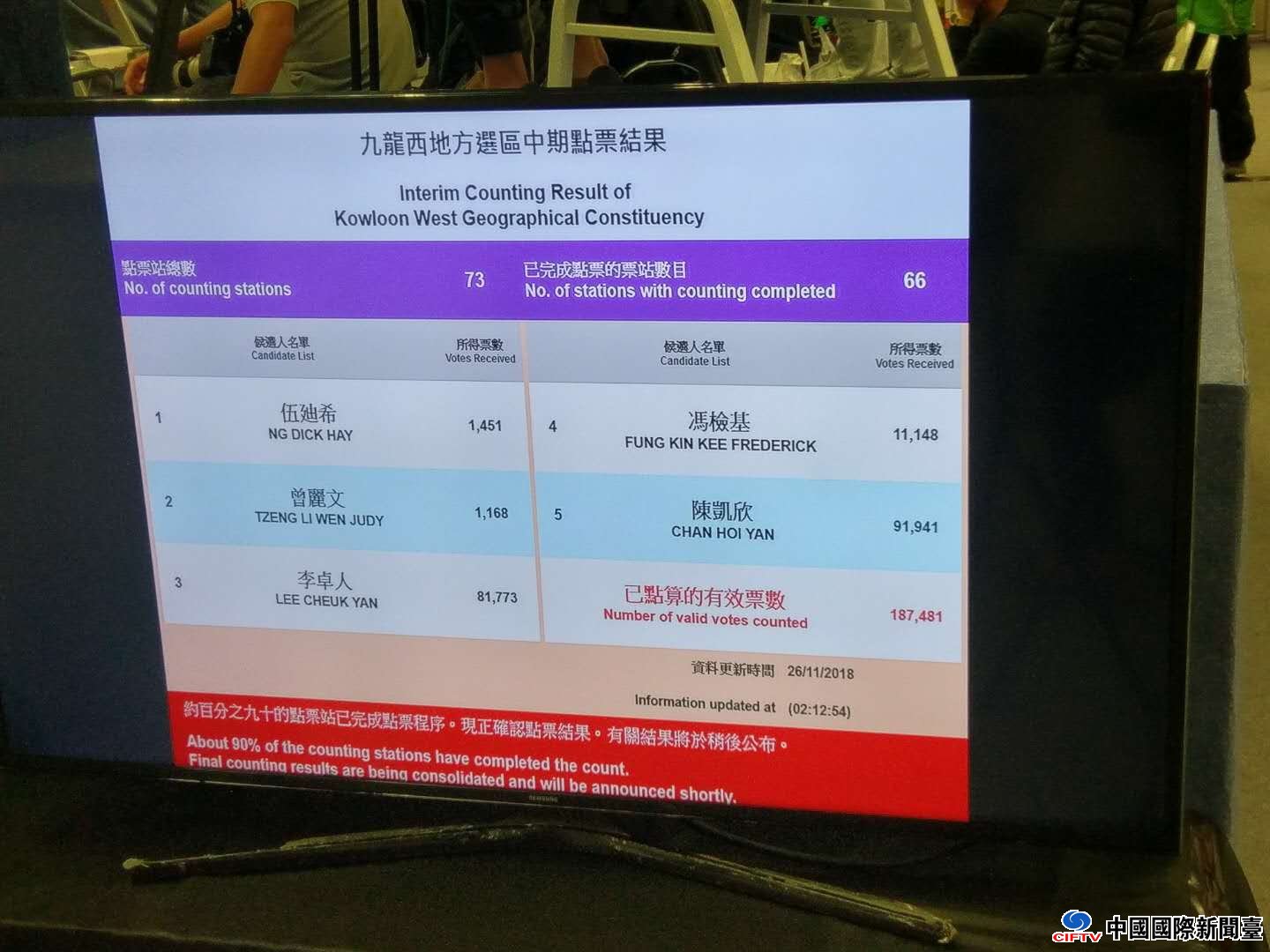 九西补选|陈凯欣已领先李卓人逾万票 2018-11-26 08:42 作者:1 立法会九龙西补选投票于25日晚上10时半结束。截至26日凌晨2时12分,选举事务处公布已点算全部73个票站当中的66个票站,陈凯欣暂时得票91,941,领先反对派的李卓人约一万多票。
