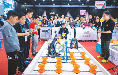 12月3日,第12届腾讯杯青少年VEX机器人亚洲锦标赛决赛在澳门举行。图为小选手在进行决赛。 |