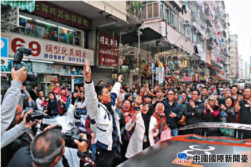 图:“币少”手持大叠现金重返深水埗,引来逾百名市民起哄/大公报记者周庆邦摄
