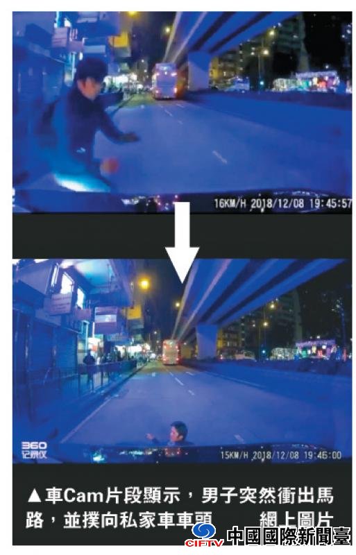 根据车Cam片段显示,本月8日晚上7时许,一辆私家车沿长沙湾道往美孚方向行驶时,一名男子突然衝出马路,并扑向私家车车头,被该车撞倒。司机停车后,双方发生争执,男子企图离开,司机上前追截时,却被女同党阻止,司机其后报警求助。