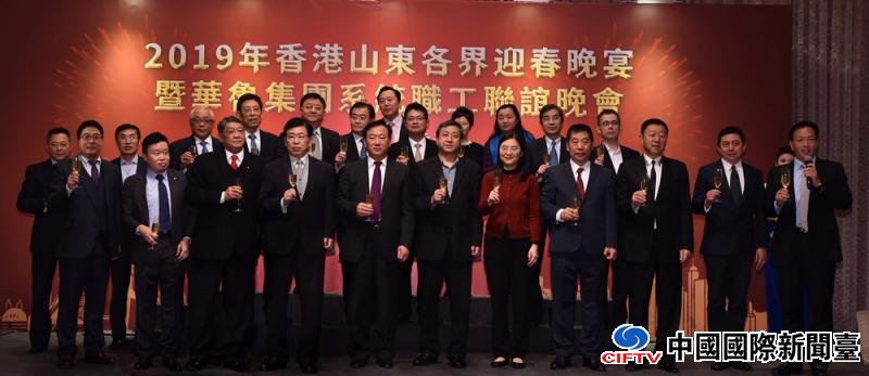 图:2019年香港山东各界迎春晚宴暨华鲁集团系统职工联谊晚会日前假港岛海逸君绰酒店举行,宾主举杯祝贺