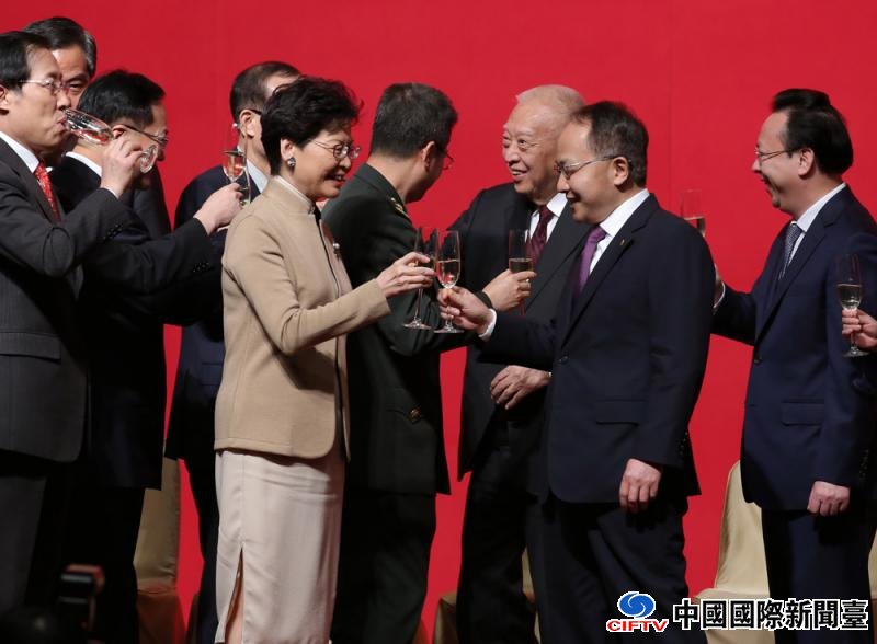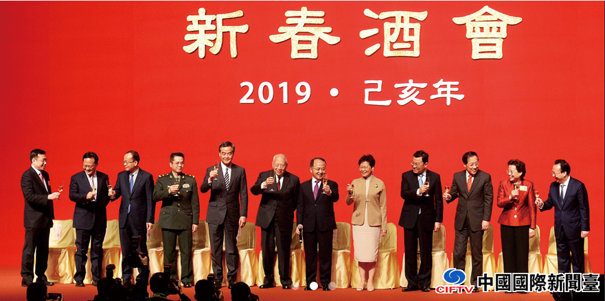 图:在香港会展中心举行的中联办2019年新春酒会上,主礼嘉宾互相祝酒致贺