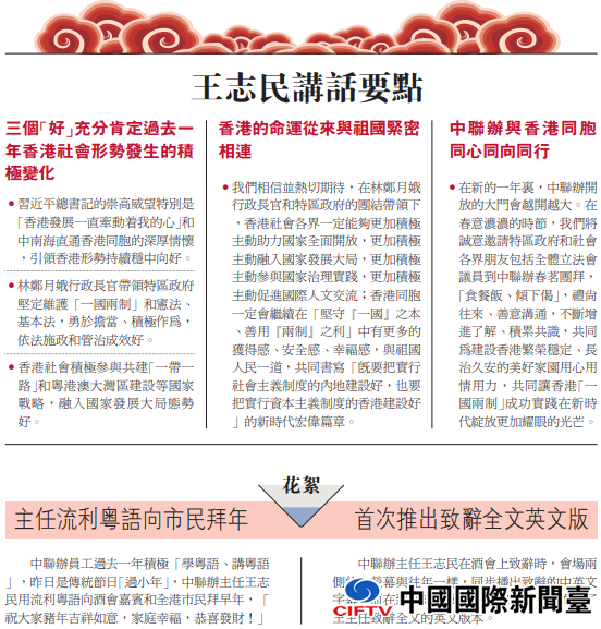 王志民在致辞中回顾了2018年党和国家事业战胜各种风浪考验取得的重大成就,并用三个“好”充分肯定了过去一年香港社会形势发生的积极变化。他说,习近平总书记的崇高威望特别是“香港发展一直牵动着我的心”和中南海直通香港同胞的深厚情怀,引领香港形势持续稳中向好;林郑月娥行政长官带领特区政府坚定维护“一国两制”方针和宪法基本法,勇于担当、积极作为,依法施政和管治成效好;香港社会积极参与共建“一带一路”和粤港澳大湾区建设等国家战略,融入国家发展大局态势好。