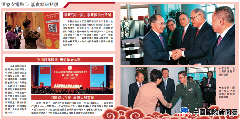 中联办过去一年实践“门常开”的理念,频繁与社会大众近距离互动,邀请市民和不同界别人士走入中联办作客,赢得社会一致好评。昨日的新春酒会上,中联办更展现积极创新的一面,推出多项新安排:在酒会场地及主礼台上分别新增两块大型电子屏幕,既可在奏唱国歌环节展出国歌,又可播放介绍改革开放40年成就的纪录片、回顾中联办过去一年工作的宣传片等;中联办又在现场摆放印有QR code的易拉架推广新设的微信官方公众号,不少出席者一到场便被吸引及驻足,拿出手机扫一扫,成为中联办的Fans。