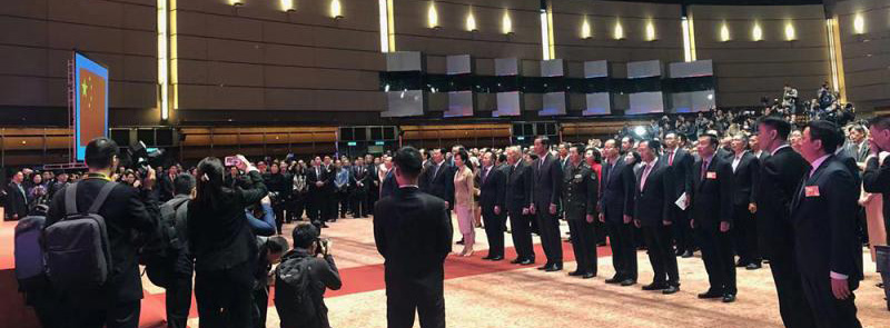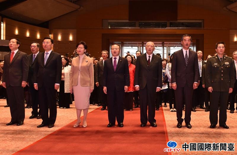 图:中联办新春酒会首次举行奏唱国歌仪式,嘉宾在台下肃立唱国歌\中新社
