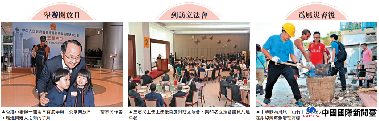 过去一年,中联办也透过多个途径参与社会活动,增强与市民的互动。去年初,中联办在官网上推出了“员工专栏”,讲述中联办员工在香港的工作经历和生活感悟。今年元旦,“香港中联办”官方微信公众号正式上线。中联办员工亦积极“学粤语、讲粤语”,并参与“香港植树日”、清理台风“山竹”损毁路段等社会公益活动。