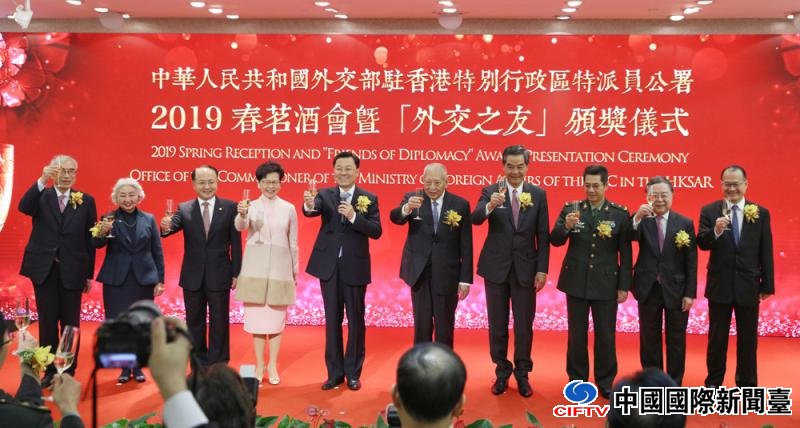 外交部驻港公署昨日举行2019年春茗酒会暨“外交之友”颁奖仪式,首次授予前律政司司长梁爱诗、恒隆集团董事长陈启宗、香港中文大学教授刘遵义,以及香港中华总商会会长蔡冠深“外交之友”称号,以表彰四人长期以来为国家外交和涉港外交做出的杰出贡献。公署特派员谢锋表示,国家外交是包括700多万香港同胞在内的全体中国人民的外交,“国家外交为香港保驾护航,香港为国家外交增光添彩”,期望未来更多香港同胞加入“外交之友”队伍,把爱国爱港爱外交的“外交之友”精神薪火相传。” 大公报记者 文轩(文) 蔡文豪(图)