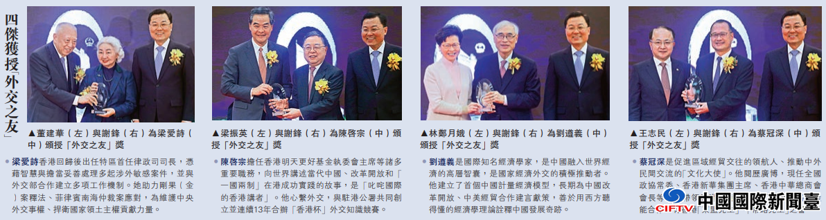 随后公署举行“外交之友”颁奖仪式,授予梁爱诗、陈启宗、刘遵义、蔡冠深“外交之友”称号,表彰他们长期以来为国家外交和涉港外交做出的杰出贡献,由董建华、梁振英、林郑月娥、王志民及谢锋为四人颁奖。