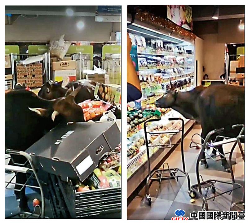图:农曆新年期间,有三头流浪牛闯进梅窝一间超级市场,在水果和蔬菜货架上的货物直接“开餐”,引发社会热话