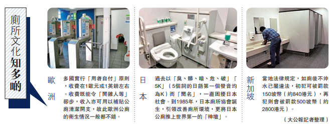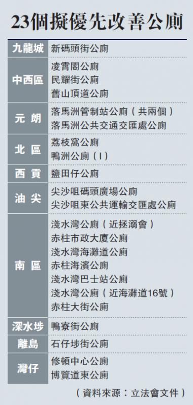 香港部分公厕的卫生情况为人诟病,即将出炉的财政预算案拟推行类似内地的“厕所革命”,特别在人流较多的旺区及旅游景点,大力改善公厕卫生及设施,提升香港国际大都会形象,从而巩固旅游业地位。消息指,全港有大约800个公厕,当局已拣选了200个,于未来数年进行翻新工程,预计投放费用为5亿元。