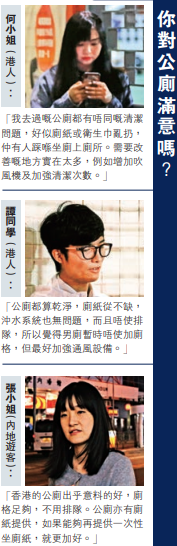 此外, “香港厕所协会”去年底到全港多个公厕进行调查,并就清洁度、设施、安全等项目进行评分。结果发现,敬陪末座的是深水埗鸭寮街公厕,坐厕污糟、地板潮湿,有八个尿兜损坏。油麻地街市公厕及荃湾杨屋道街市公厕,分别排尾二及尾三,问题包括公厕徒有硬件设备,却无补充洗手液及厕纸等。