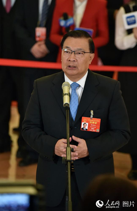 全国人大常委会委员、香港立法会原议员谭耀宗回答记者提问。人民网记者 翁奇羽 摄