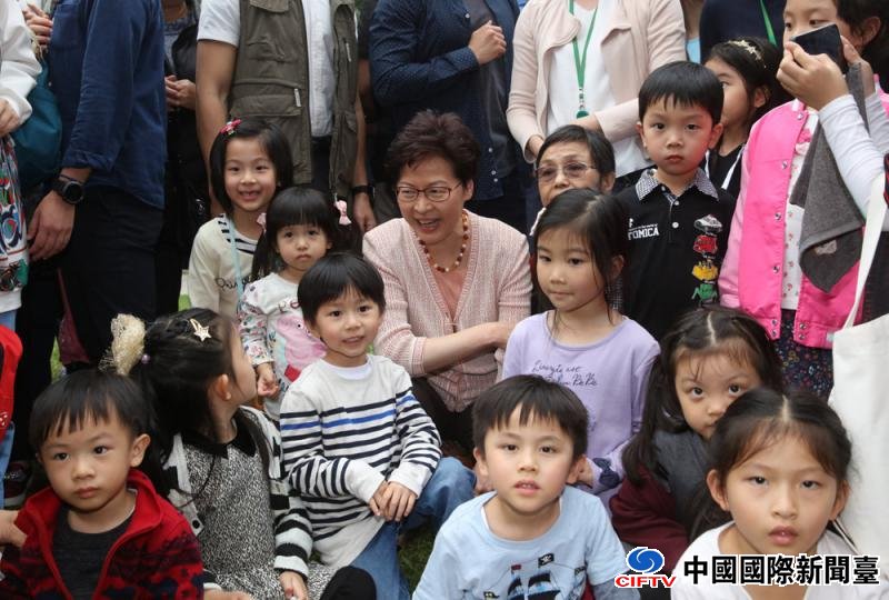 图:特首林郑月娥在礼宾府开放日与小朋友一起合照