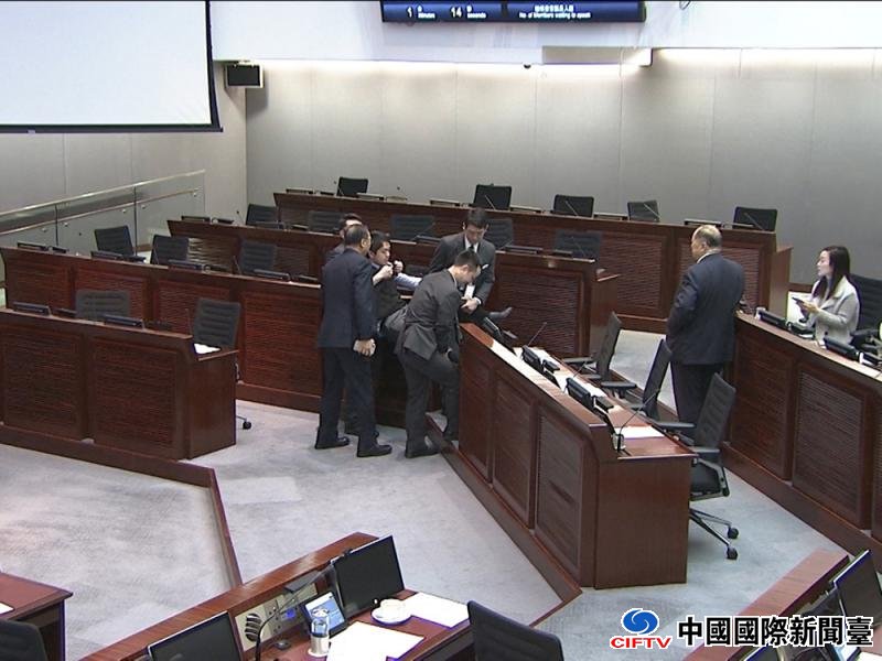 上周六国歌条例草案公听会上,三名众志成员在会议期间衝出座位,导致一名保安人员受伤。昨日又发生类似事件。国歌条例草案委员会主席廖长江在会上宣布,议员需在周五前透过委员会向政府当局提交书面问题,逾期后不再转交当局。在场反对派议员集体反对该项提议,许智峯更向廖长江表示不满并叫嚣,廖警诫会执行《议事规则》。但许智峯继续叫嚣,廖长江下令驱逐他离场,许智峯拒绝离开,最后被四名保安人员抬走,他其后竟“恶人先告状”,报称受伤并报警。