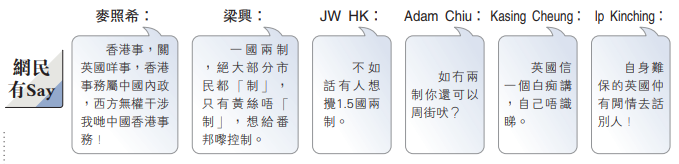 英国国会一委员会声称,担忧香港走向“一国一点五制”。近年频赴海外唱衰香港的“香港众志”黄之锋随即“邀功”,扬言这是其“向来惯用的说辞”。政制及内地事务局反驳说,自回归以来,香港特别行政区一直严格按照《基本法》的规定实行“港人治港”、高度自治,充分体现“一国两制”得到全面和成功落实。政界人士批评英国会报告偏听,认为英美一直片面引用反对派的谬论,重操冷战时的心战把戏,所谓的“报告”只是另有用心的政治操作。