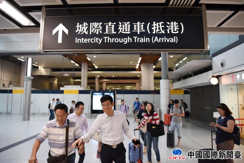 图:广九直通车恢复运行四十年来,极大加强粤港两地间联繫,左图为搭乘广九直通车的旅客抵达香港 资料图片