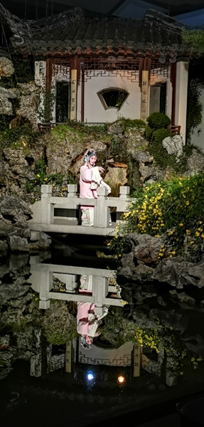 观看演出。本次游学,在苏州昆剧院观看了两场演出——一是厅堂折子戏导赏与演出,一是实景版《游园惊梦》的首演。其中,实景版的演出,以亭台楼阁、湖山环绕的精致场景,以及绚丽梦幻般的灯光,让人大有不知斯世何世、不知身处何处之感。