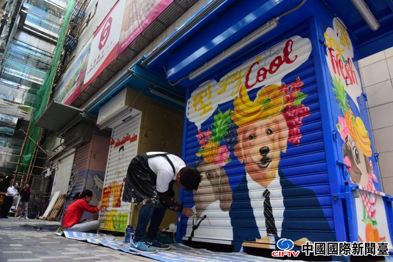 其中一档已完成美化的同文街袁记时果档主袁石伟称,摊档由父亲开始经营,50年风吹雨打,铁架铁闸常生鏽。美化工程二月展开,除了绘上各款水果,还特意讬画家将袁家的三头已离世爱犬,绘在摊档上。画家黄志豪说,三条狗均打呔着西装,象征中环是上班族频繁出入之地,选用醒神的色彩,为上班族打气。
