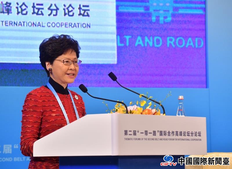 图为林郑月娥出席“一带一路”国际合作高峰论坛的分论坛发言(政府新闻处)