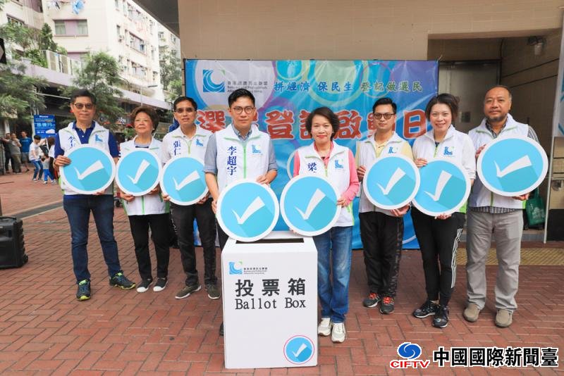 图:经民联成员把印有剔号的道具纸牌放进模拟投票箱内,为一系列选民登记活动揭开序幕