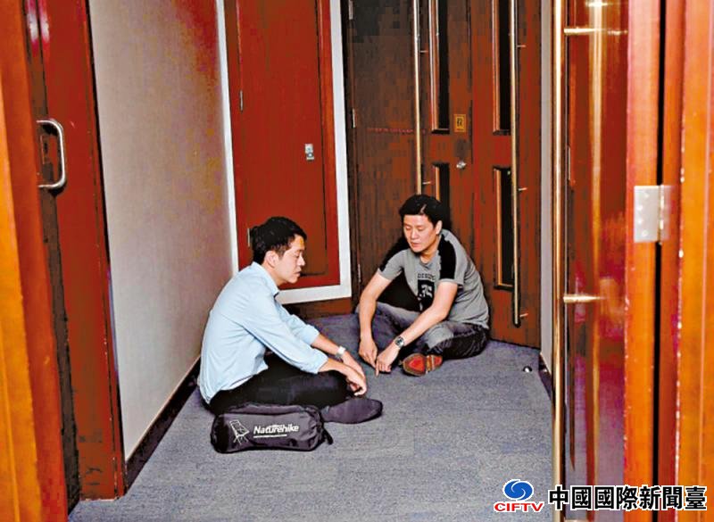 图:谭文豪、许智峯抢佔会议室不果,索性坐地堵住大门\大公报记者林良坚摄