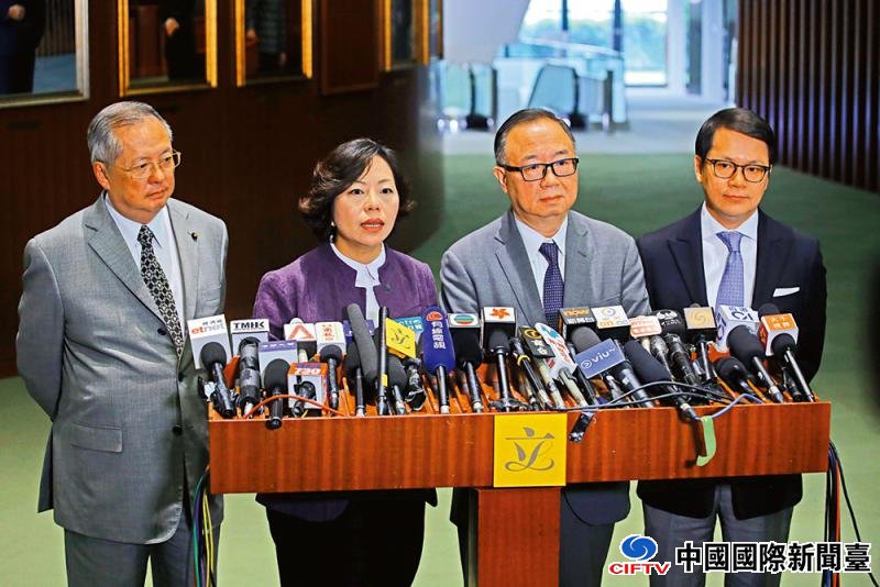 图:张宇人(左起)、麦美娟、廖长江和陈克勤昨与反对派会面。廖长江批评反对派根本无诚意展开对话及化解困局,令会面变成“公关骚”\大公报记者何嘉骏摄