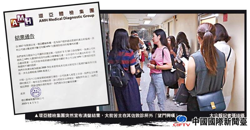 《大公报》自四月起推出连串独家报道,揭发水货HPV疫苗肆虐香港。早前被藥厂点名从未获供应正货疫苗的环亚体检集团,昨突然宣布清盘结业,消息传出后,大批内地苦主登门追讨不果,无奈又无助,只好报警备案。海关证实,前日採取联合行动,拘捕环亚两名集团董事,被捕人士现正保释候查。有立法会议员批评,相关诊所在未有调查结果下,透过结业清盘逃避法律责任或赔偿,影响顾客对香港医疗机构的信心。法律界人士指出,环亚清盘后,顾客只能透过民事索偿追讨,赔偿的次序排在较后位置,需时也较长,要顺利获得赔偿非常困难。