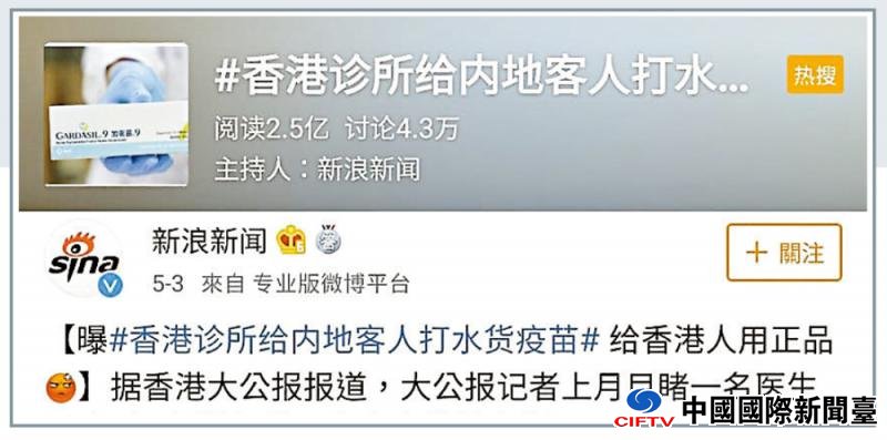 《大公报》在今年4月29日起及五.一黄金周期间,持续报道水货疫苗事件,引起广泛关注,“香港诊所给内地客人打‘水货疫苗’”这话题,在内地微博的阅读量已超过2.5亿次(图),本港多间媒体,以及内地如央视、凤凰卫视、《环球时报》、《新京报》等纷纷跟进报道。不少媒体更转载《大公报》独家调查报道製作警示内容,网友好评如潮,称令其加倍关注注射的疫苗来源,纷纷呼籲香港有关部门、卫生署要严查“水货针”诊所,并调查“水货疫苗”的来路。