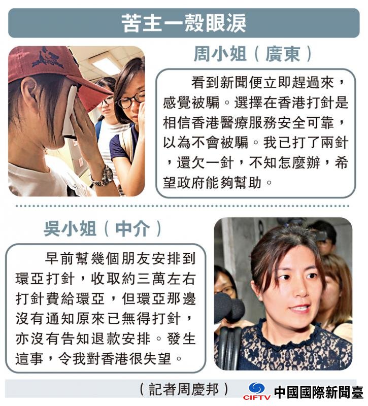 环亚宣布清盘结业消息传出后,大批内地客上门了解情况,部分更专程由上海、南京等地来港。来自深圳的王小姐表示,早前与朋友共12人,透过中介购买了环亚HPV疫苗疗程套餐,涉及款项共约7万元,月前得知该公司陷入水货疫苗风波时已感担心。昨日原本到香港购物,惟有朋友告知环亚结业,特意到场了解。“现在对事情感到很无奈,没法向朋友交代,因为不熟悉香港的追讨款项途径,暂时未知如何处理。”