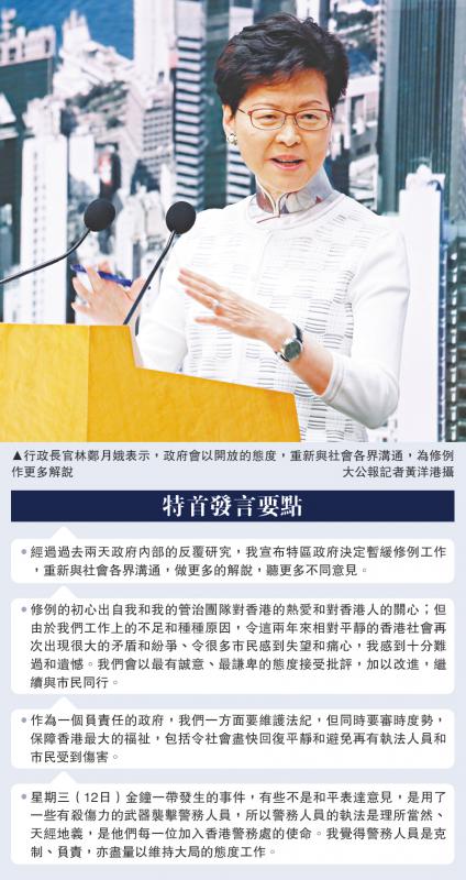 反对派百般阻挠、抹黑《逃犯条例》修订,日前的示威更演变成暴动。行政长官林郑月娥昨宣布,为保障香港最大福祉,让社会尽快回复平静,决定暂缓修例,重新谘询,不设重推时限。政府会以开放态度聆听更多不同意见、争取把好事办好,并承诺就工作不足接受批评,加以改进。她强调,特区政府藉修例确保香港不沦为“逃犯天堂”的初心站得住脚,因此不会撤回修例。对於“台湾杀人案”受害者家属可能永远盼不来公道,特首说,已尽最大努力,希望他们释怀。外交部、港澳办、中联办、外交部驻港公署均表示,对林郑月娥暂缓修例工作的决定表示支持、尊重和理解,强调中央政府将继续坚定支持林郑月娥和特区政府依法施政。大公报记者 莊恭诚