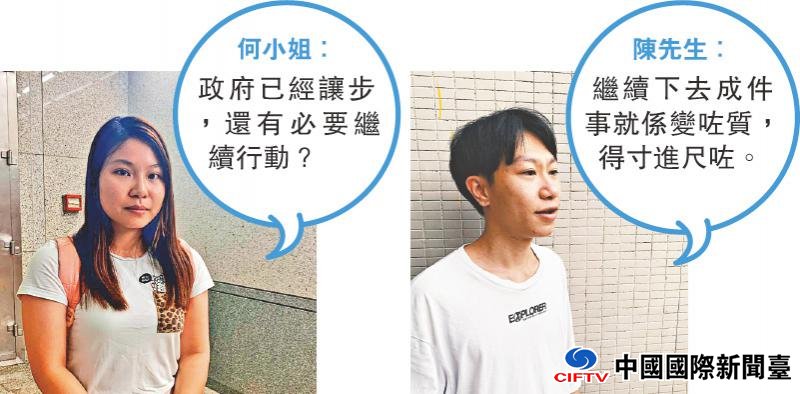 曾上街遊行反修例的学生陈先生称,政府在修例一事已经让步及道歉,“继续(反对)落去我觉得成件事就係变咗质,有点得寸进尺,咁样嘅性质我不太支持。”