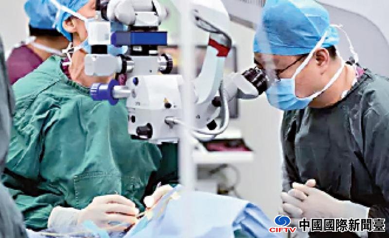 图:郭坤豪(左)施手术期间,内地玻璃体视网膜与眼外伤疾病专家赵海生(右)在旁观摩