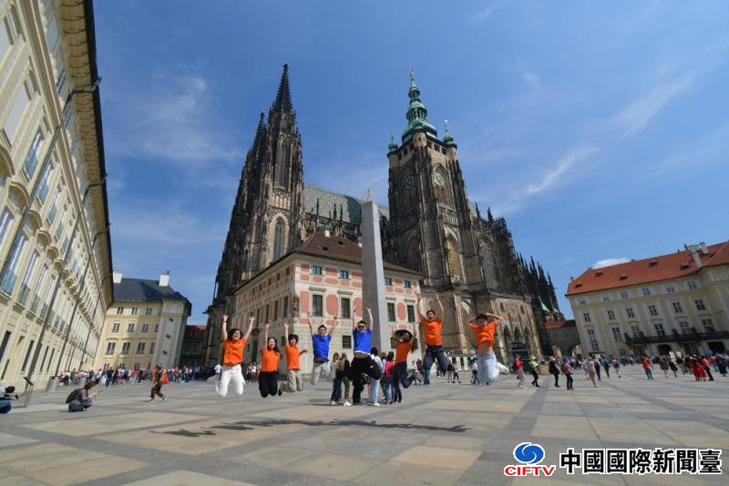 图:交流团学员们在布拉格圣维特主教座堂前兴奋一跃