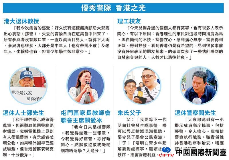 曾在电影《寒战》中扮演警务处副处长的梁家辉手持“阿sir 我撑你”的纸牌,表示警方值得支持。钟镇涛则直言,自己是谈正义而非政治。著名男高音歌唱家莫华伦带领在场所有人唱《狮子山下》,场面非常震撼及令人感动。