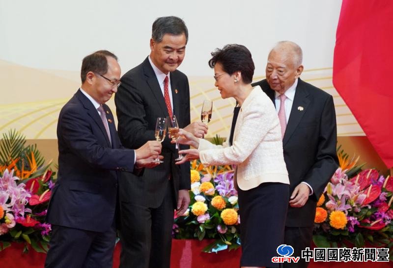 在祝酒儀式上,在場人士紛紛舉杯,共賀特區成立22周年。全國政協副主席董建華輕拍行政長官林鄭月娥手臂,以示鼓勵。林鄭月娥感謝立法會主席梁君彥連日來不辭辛苦,梁君彥舉杯道:「加油!繼續努力!」政務司司長張建宗亦在一旁說:「CE(特首)加油!」短短幾語,展現大家竭盡所能緩解社會焦慮、力求發展經濟、改善民生,為香港齊加油的決心。