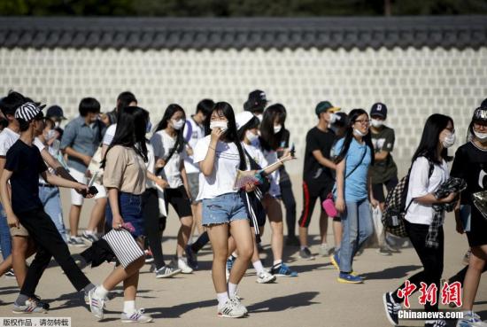 6月3日,在韩国首尔市中心的商业区,游客戴口罩出行。
