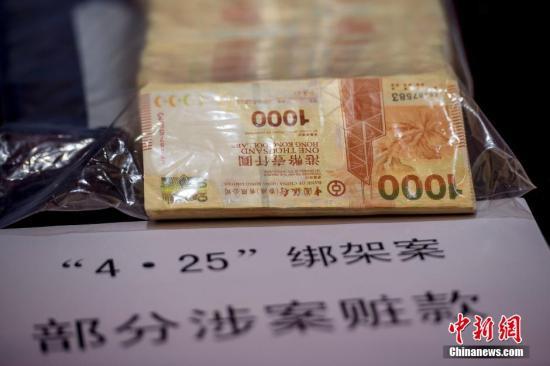 资料图:5月14日,广东省公安厅举行新闻发布会,详细披露侦破香港“4·25”特大绑架案细节。图为警方现场展示部分涉案赃款。