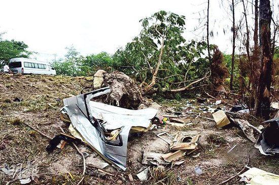 车祸现场路边仍散满一地杂物,包括被撞至连根拔起的大树、飞脱的车门、玻璃碎片等。